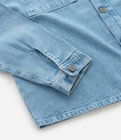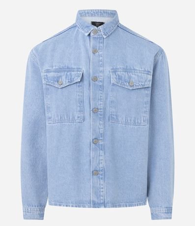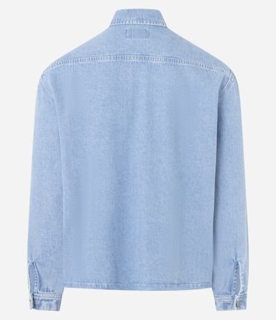 Camisa masculina confeccionada em jeans mais sustentável com boas práticas ambientais no modelo boxy, possui gola colarinho, manga longa, bolsos grandes no peito, abotoamento frontal e nos punhos, recorte nos ombros e efeito marmorizado.