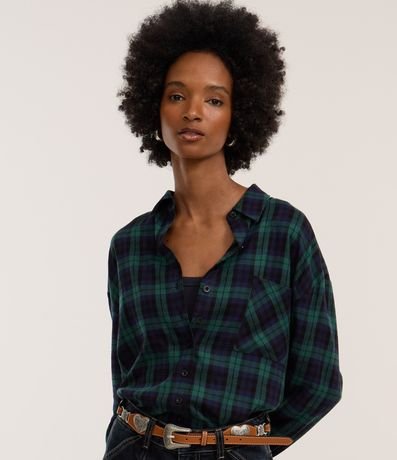 Camisa oversized com manga longa, flanela com bolso no peito, xadrez e com abotoamento frontal.