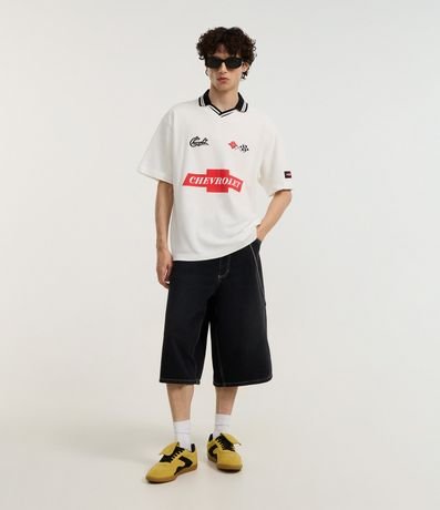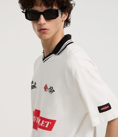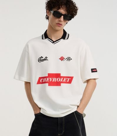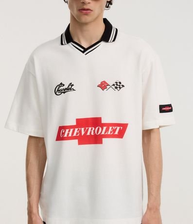 Ref: Camisa polo masculina confeccionada em algodão mais sustentável, no modelo boxy. Possui gola contrastante, manga curta e estampa lettering "Chevrolet".