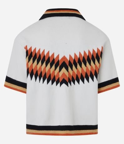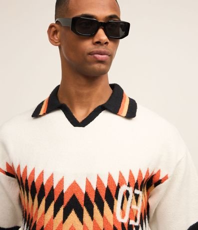 Ref: Polo masculina confeccionada em tricô, com gola colarinho listrada, manga curta com listras. Peça no modelo boxy com estampa localizada abstrata com cores contrastantes e o número 03.