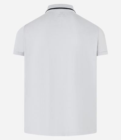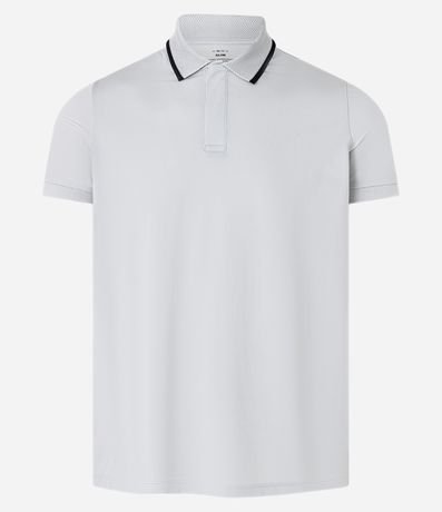 Camisa masculina de modelo polo, confeccionada em malha de poliéster com elastano, com mangas curtas, sem estampa e com detalhe contrastante na gola.