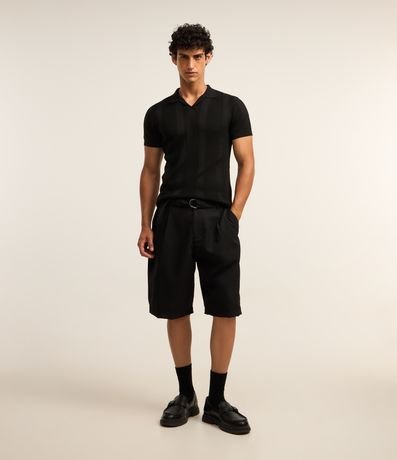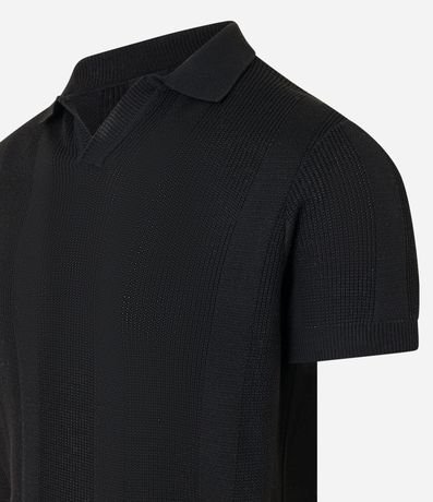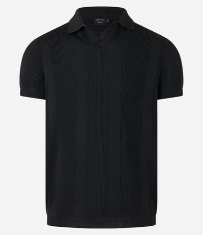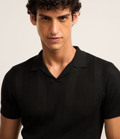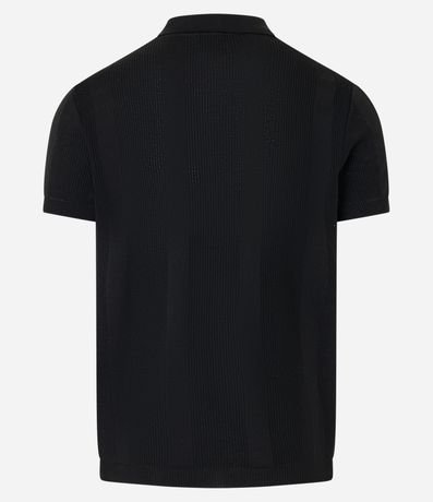 Camisa polo masculina confeccionada em práticas ambientais mais sustentáveis. Peça tradicional com textura e efeito de listras verticais.