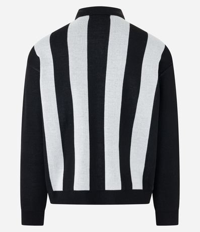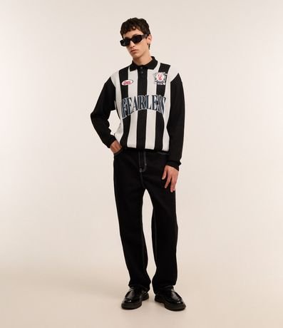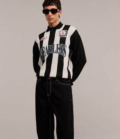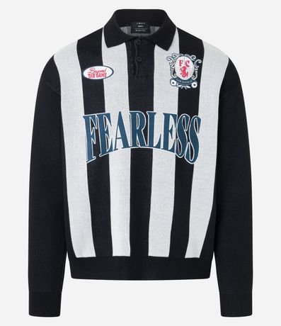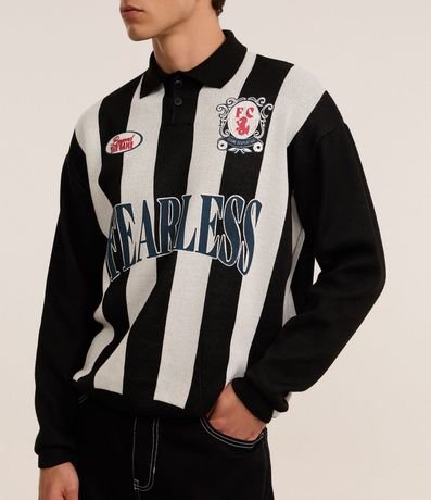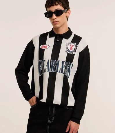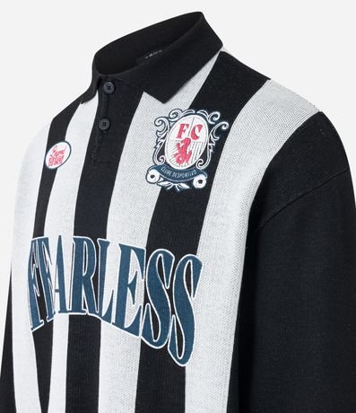 Camisa polo esportiva masculina confeccionada em tricô através de boas práticas ambientais, no modelo boxy. Possui botões na gola, manga longa, padronagem de listras, estampa localizada e lettering.
