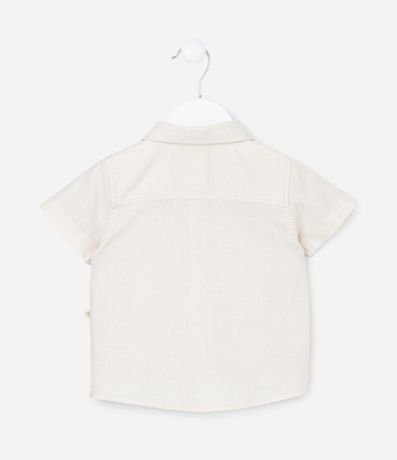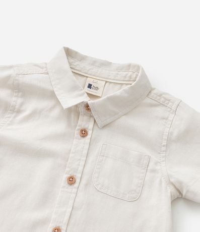 Camisa infantil confeccionada em linho e algodão mais sustentável, gola polo, abotoamento frontal, bolsinho e manga curta.