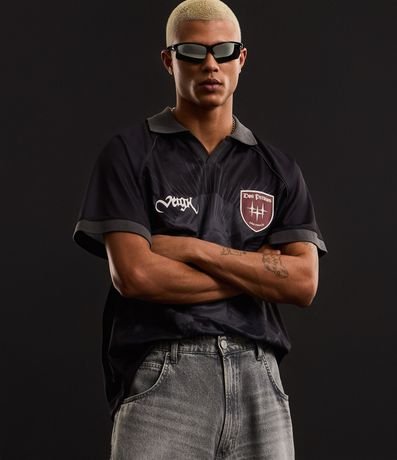 Ref: Camisa polo masculina confeccionada em poliéster, no modelo oversized. Possui gola v, manga curta, estampa angelical e lettering "Cada um oferece o que tem", Veigh.
