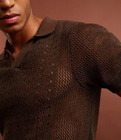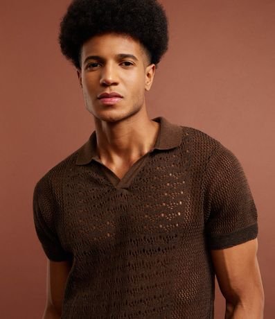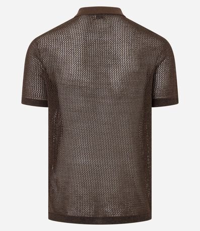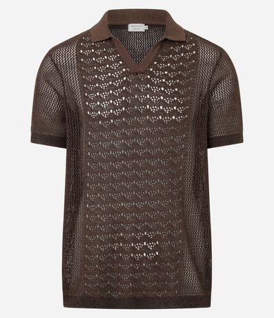 Ref: Camisa polo masculina confeccionada em algodão mais sustentável com boas práticas ambientais, no modelo regular, possui decote v, manga curta e efeito crochê.
