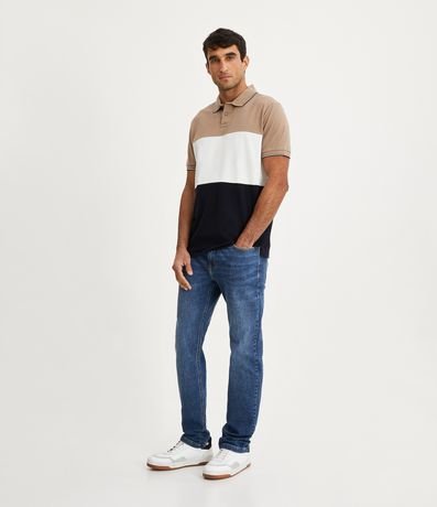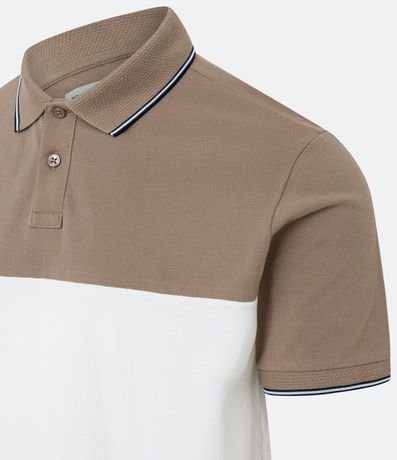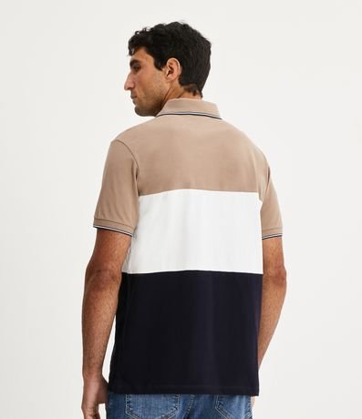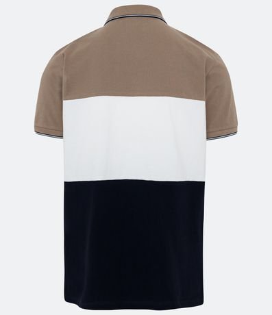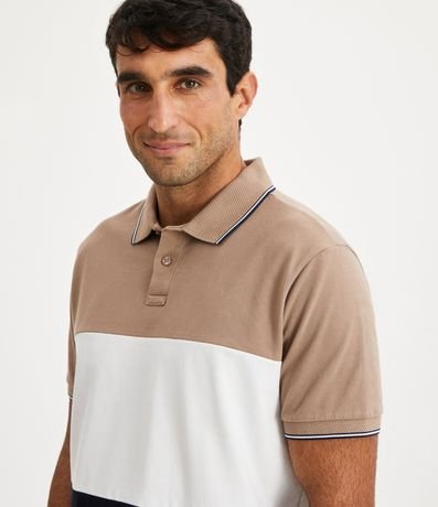 Polo masculina, modelo regular, confeccionada em algodão, com gola convencional, mangas curtas e blocos de cor.