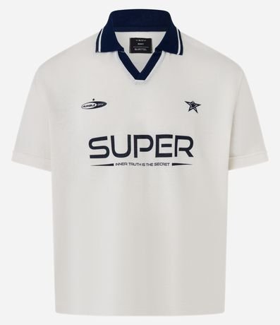 Camisa masculina confeccionada em algodão mais sustentável com boas práticas ambientais. No modelo boxy sportcore com gola polo, manga curta e estampa lettering.