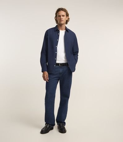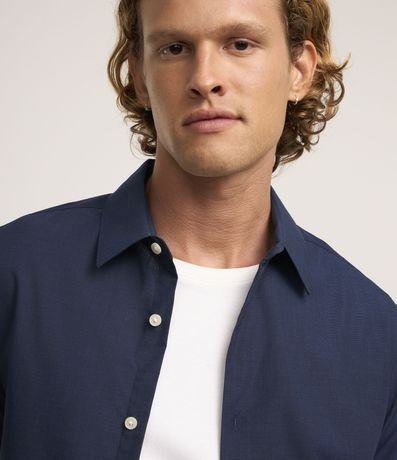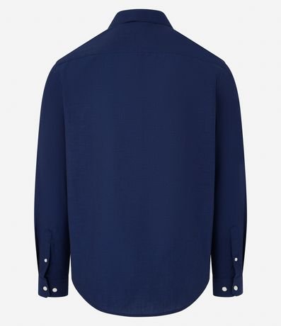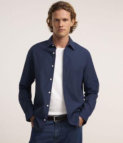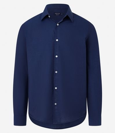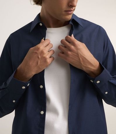 Camisa masculina de modelo regular, confeccionada em um mix de algodão mais responsável e poliéster, possui gola colarinho tradicional e mangas longas.