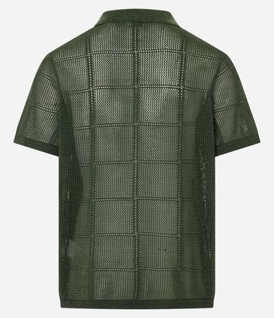 Ref: Camisa masculina confeccionada em poliéster mais sustentável com boas práticas ambientais, no modelo regular. Possui gola lapela, manga curta, abotoamento frontal, efeito crochê e textura quadriculada.