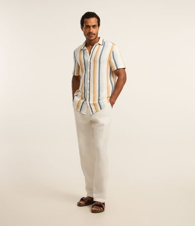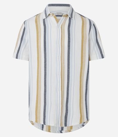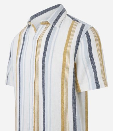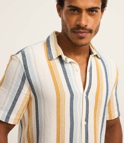 Ref: Camisa masculina confeccionada em algodão mais sustentável, no modelo regular, peça contém gola colarinho, abotoamento frontal, manga curta, textura e uma padronagem de listrar verticais contrastantes.