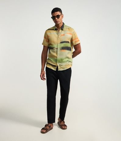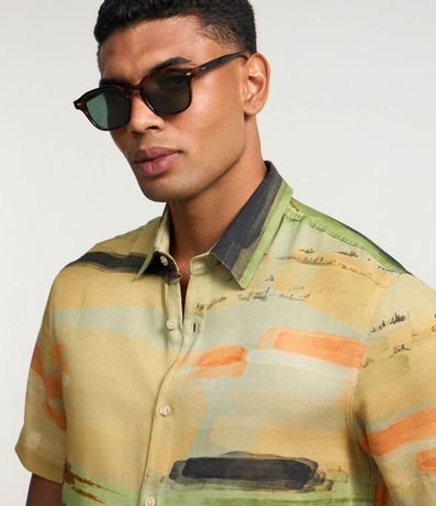 Ref: Camisa masculina confeccionada em cambraia mais sustentável, no modelo regular, possui gola colarinho, manga curta, abotoamento frontal e estampa de paisagem estilo aquarela.