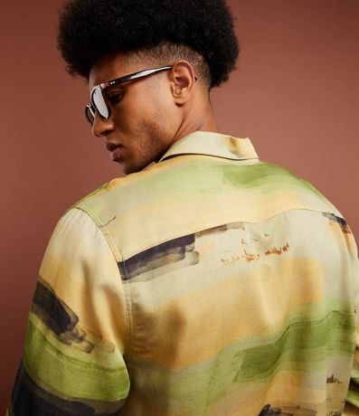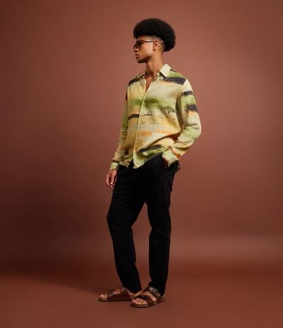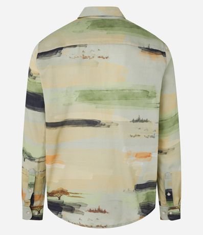 Ref: Camisa masculina confeccionada em cambraia mais sustentável no modelo regular, possui gola colarinho, manga longa, abotoamento frontal e estampa de paisagem com efeito aquarela.
