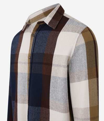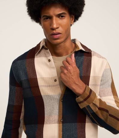 Camisa masculina confeccionada em flanela no modelo regular com gola colarinho, abotoamento frontal, manga longa ajustada e estampa xadrez com cores contrastantes.