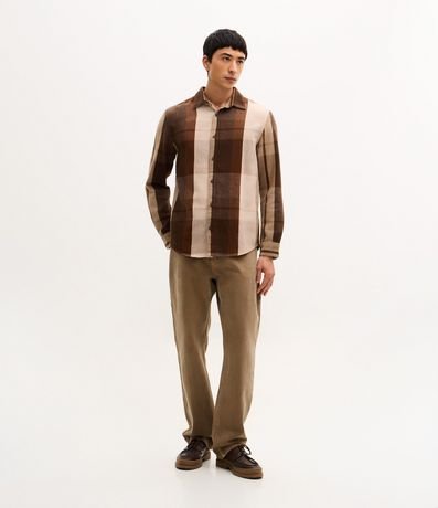 Camisa masculina confeccionada em flanela no modelo regular com gola colarinho, abotoamento frontal, manga longa ajustada e estampa xadrez com cores contrastantes.