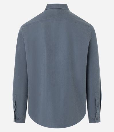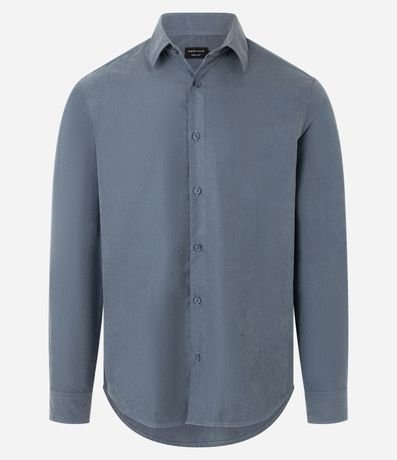Camisa masculina confeccionada em sarja, no modelo regular. Possui gola colarinho, manga longa, com punhos ajustados por botões, sem estampa e abotoamento frontal.