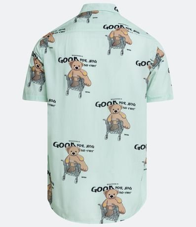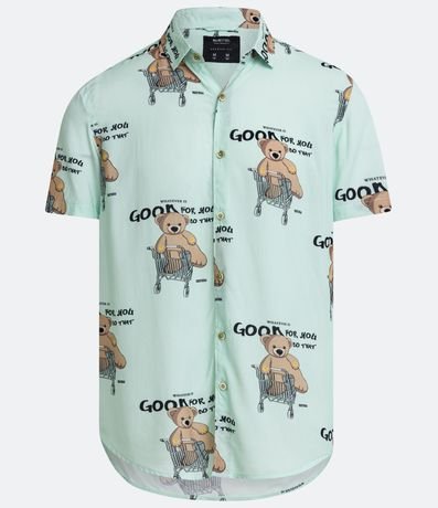 Ref: Camisa regular masculina, confeccionada em viscose mais sustentável, com gola colarinho, mangas curtas, abotoamento frontal e estampa de urso no carrinho com lettering.