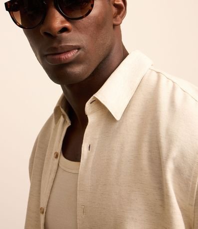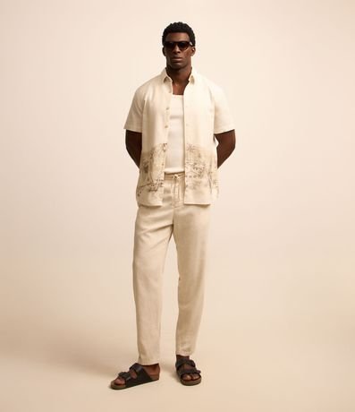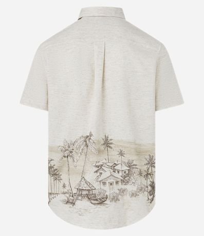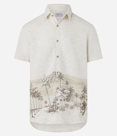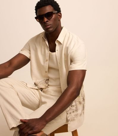 Ref: Camisa masculina, modelo comfort, confeccionada em voil, gola colarinho, abotoamento, manga curta. Peça com estampa na barra de cenário de interior.