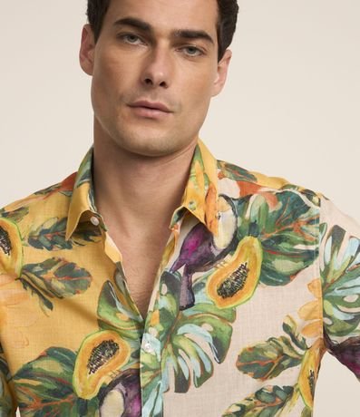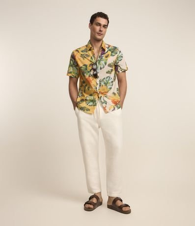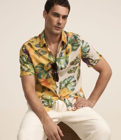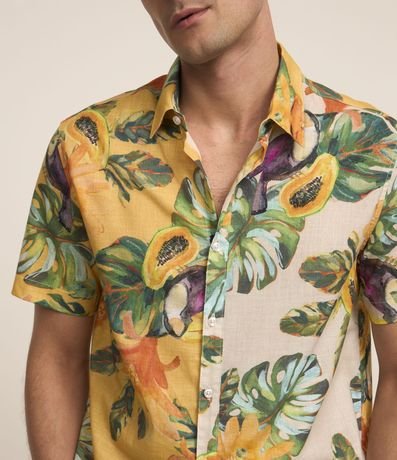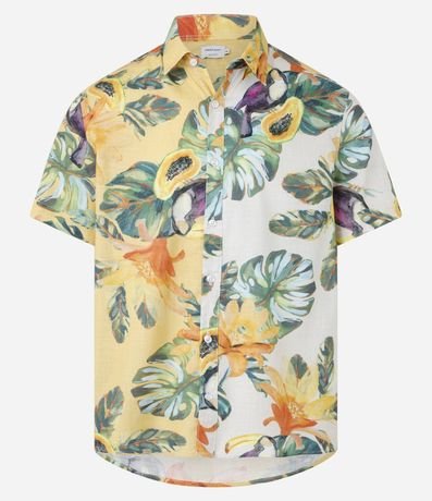 Ref: Camisa masculina confeccionada em voil, gola colarinho, abotoamento frontal, manga curta. Peça no modelo regular com estampa tropical.