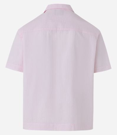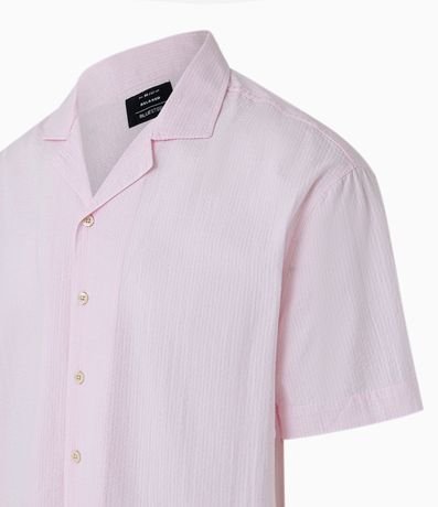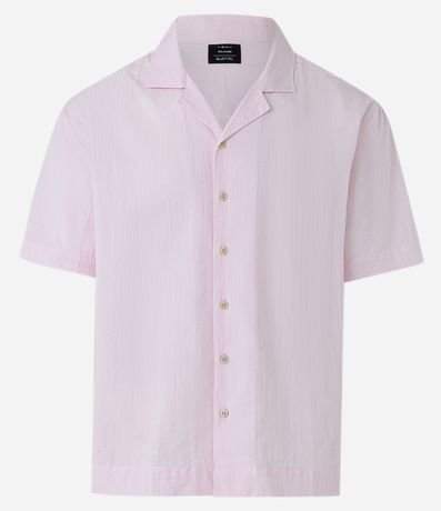 Camisa relaxed masculina, confeccionada em tecido Ana Ruga, com gola colarinho, lapela, mangas curtas com cava deslocada, abotoamento frontal e textura.
