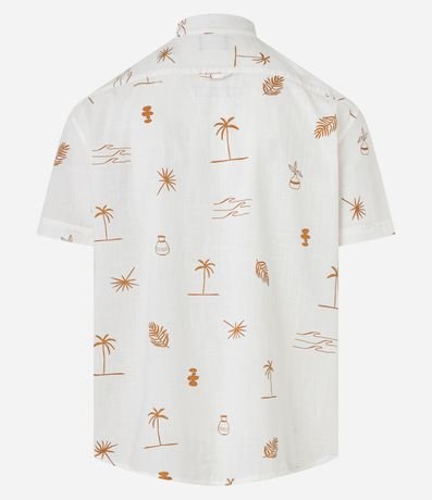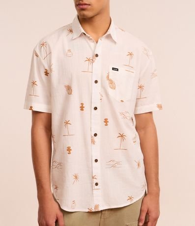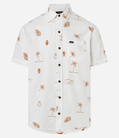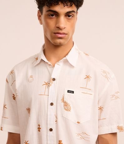 Ref: Camisa masculina confeccionada em tricoline mais sustentável no modelo relaxed, possui gola colarinho, manga curta, abotoamento frontal, bolso, com etiqueta aplicada e estampa mini ícones tropicais.