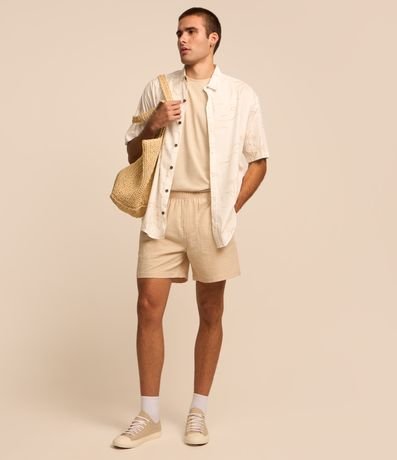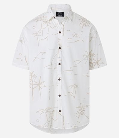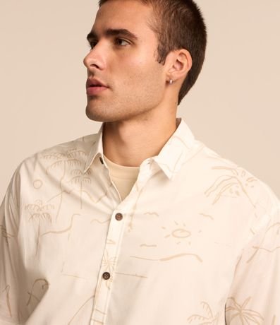 Camisa masculina, modelo relaxed, confeccionada em material mais sustentável, gola colarinho, abotoamento frontal, manga curta. Peça com estampa minimalista que remete á elementos de ilha.