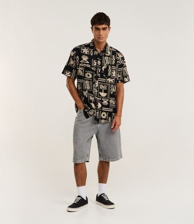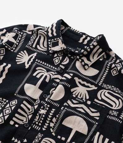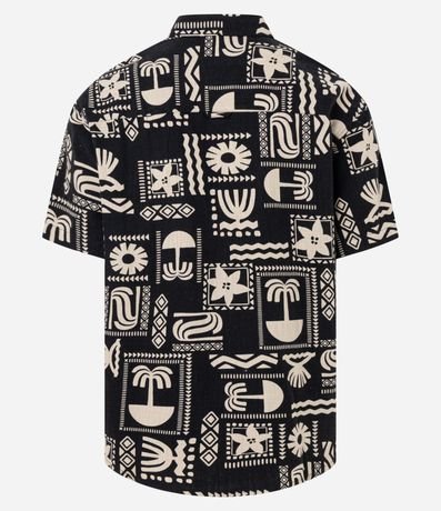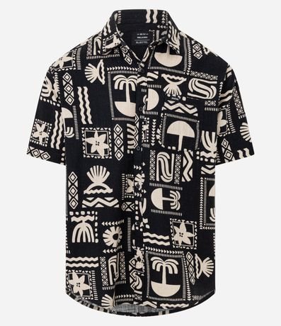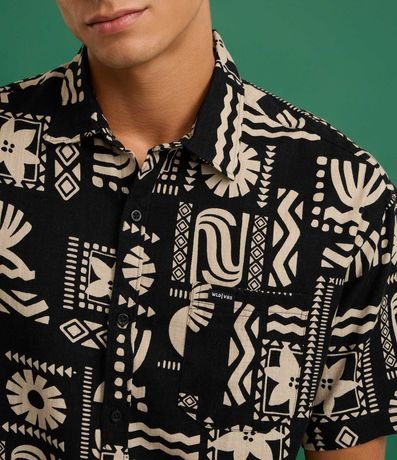 Ref: Camisa masculina relaxed com estampa verão abstrata, gola colarinho e bolso. Confeccionada com processo mais sustentável e algodão certificado BCI. Estilo leve e moderno.
