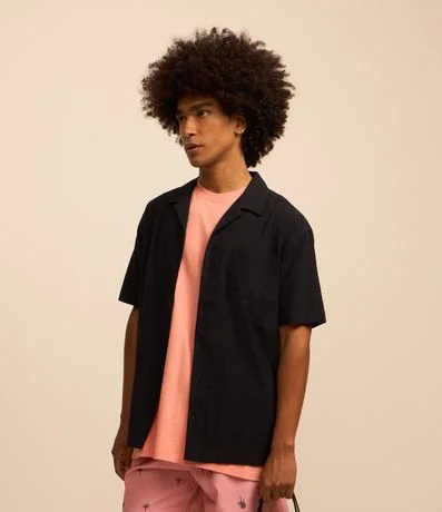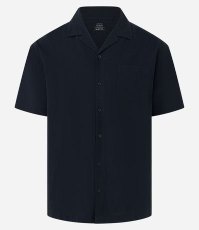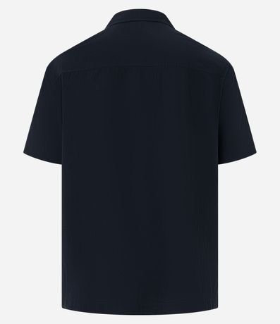 Camisa masculina confeccionada em tricoline, gola com lapela, manga curta, abotoamento frontal. Peça no modelo relaxed com textura bowling.