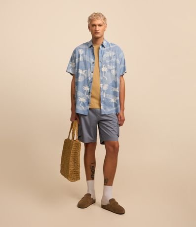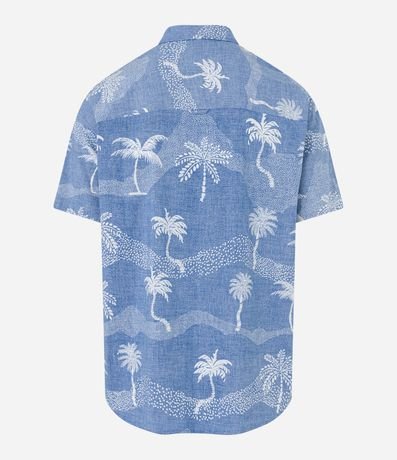 Camisa masculina confeccionada em material mais sustentável, gola com lapela, abotoamento frontal, manga curta. Peça no modelo relaxed com estampa pontilhada de coqueiros.