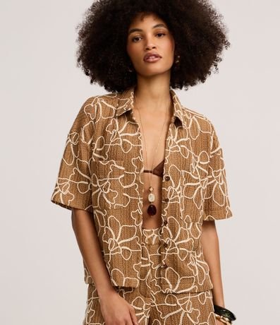 Camisa texturizada de mangas curtas, confeccionada em renda, com colarinho na gola, botões frontais e cordinhas aplicadas com formas abstratas. Peça com bolsos nos peitos.