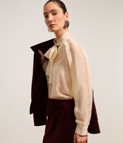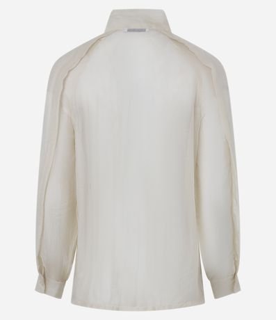 Camisa de mangas longas, confeccionada em voal, com gola laço com botões frontais e tecido texturizados. A textura desta camisa tem efeito sofisticada com aspecto amassadinho.