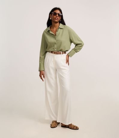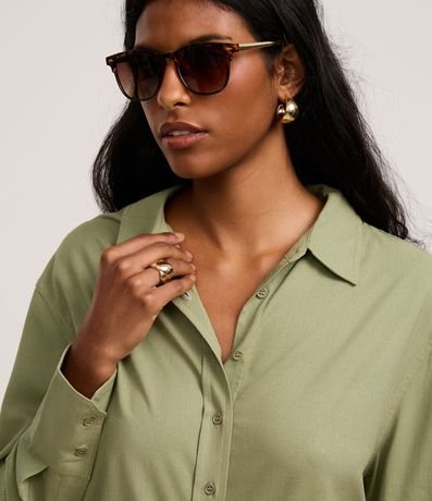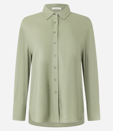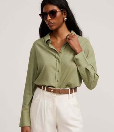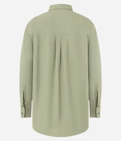 Camisa feminina alongada, confeccionada em viscose e linho, possui mangas longas e fechamento por botões.