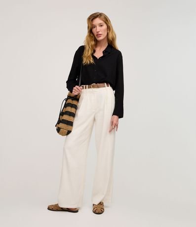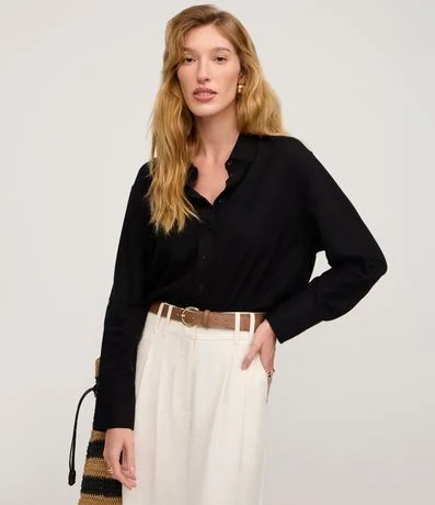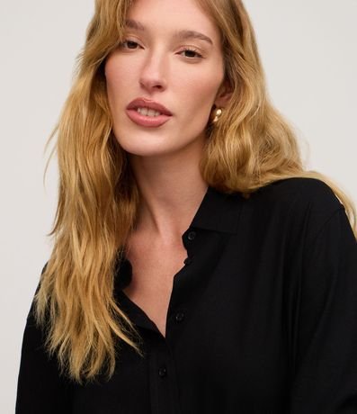 Camisa feminina alongada, confeccionada em viscose e linho, possui mangas longas e fechamento por botões.