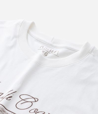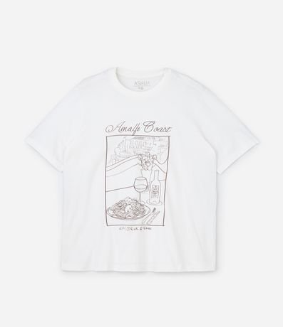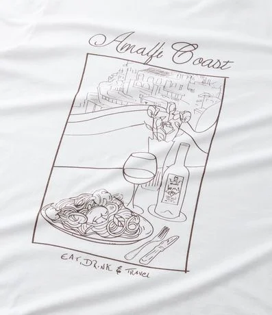 Camiseta feminina alongada confeccionada com material mais sustentável. Possui gola redonda, mangas curtas e estampa de mesa com prato e vinho e lettering "Amalfi Coast".