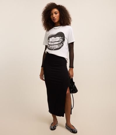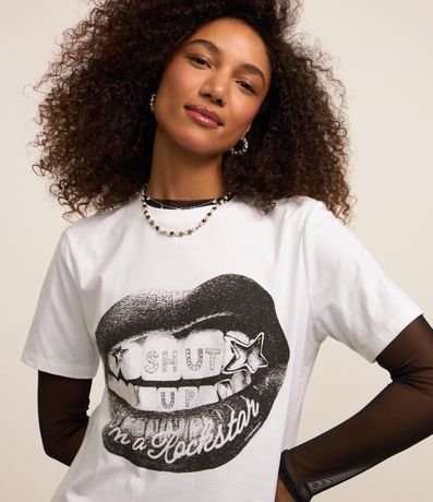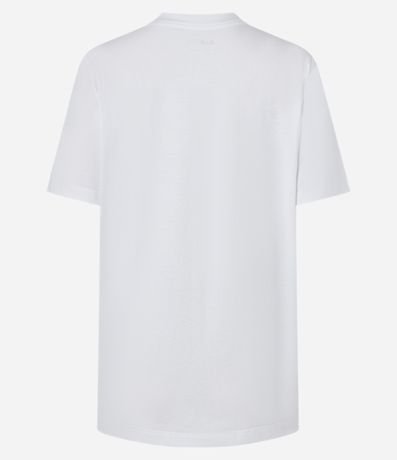 Ref: Camiseta t-shirt, alongada com manga curta, confeccionada em algodão mais sustentável e estampa frontal boca com lettering.