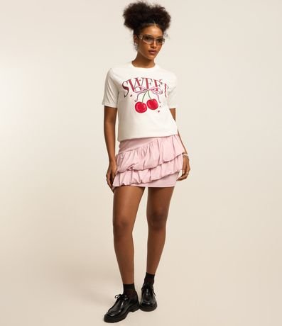 Ref: Camiseta t-shirt, alongada com mangas curtas, confeccionada em algodão mais sustentável e estampa frontal Sweet e cerejinhas.