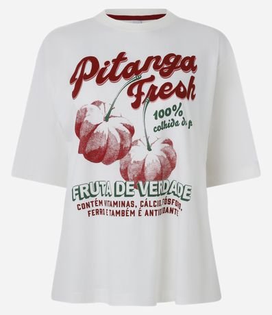 Ref: Camiseta feminina confeccionada em algodão, modelo alongado com gola redonda, manga curta e estampa de pitanga fresh.
