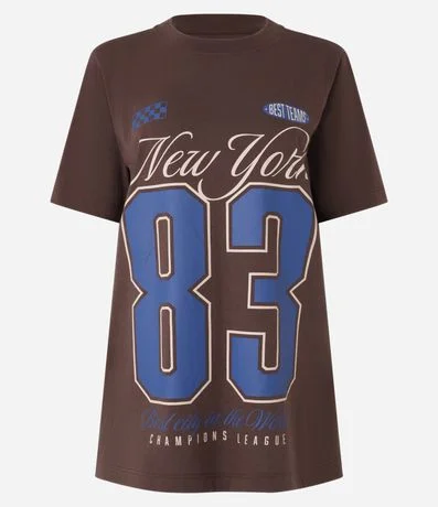Ref: T-shirt alongada de algodão mais sustentável. A peça estilo colegial esportivo tem gola redonda, mangas curtas e estampa frontal grande 83.