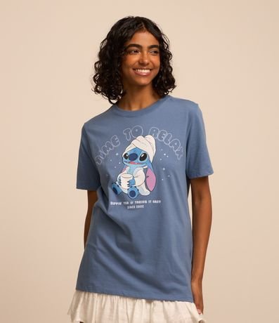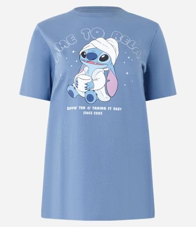 Ref: Camiseta t-shirt, alongada com mangas curtas, confeccionada em algodão e com estampa frontal Stitch com lettering Time to Relax.