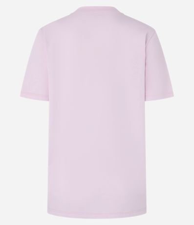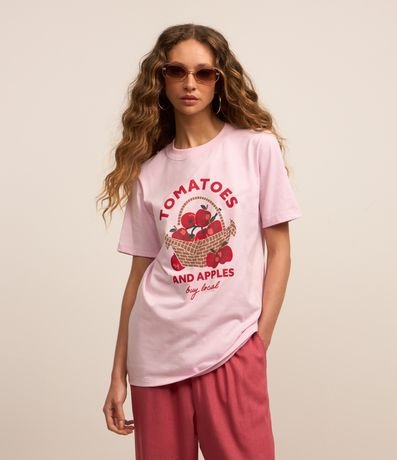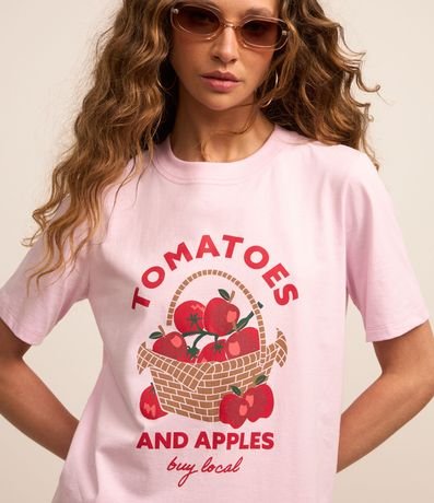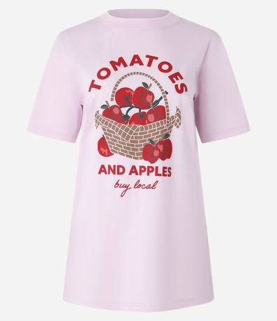 Camiseta t-shirt, alongada com manga curta, confeccionada em algodão mais sustentável e estampa frontal, tomates e maçãs.