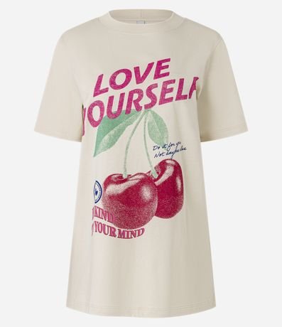 Ref: Camiseta feminina de modelo alongada, confeccionada em malha de algodão mais responsável, com gola redonda e mangas curtas. Possui estampa frontal divertida de cerejas, com lettering "love yourself".