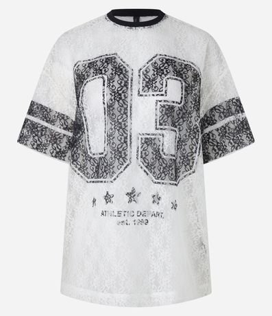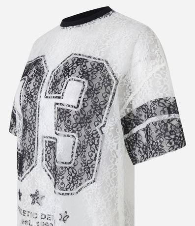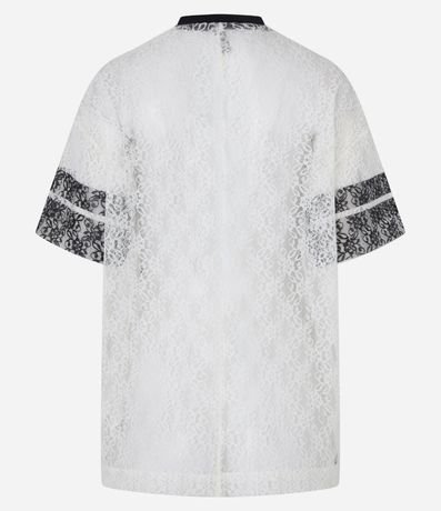 T-shirt manga curta, confeccionada em renda com transparência, listras nas mangas e estampa frontal 03.