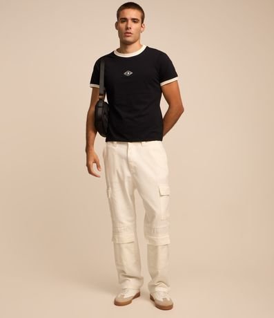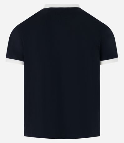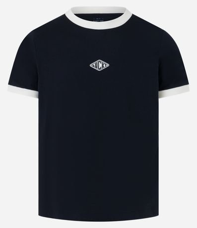 Ref: Camiseta baby tee, em algodão com etiqueta emborrachada no peito e gola e barra das mangas contrastantes.