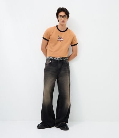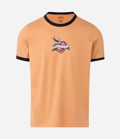 Camiseta masculina confeccionada em meia malha de algodão mais sustentável, com manga curta, modelagem baby tee e estampa localizada “Coração Broken”, ideal para um visual fashion e expressivo.