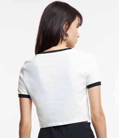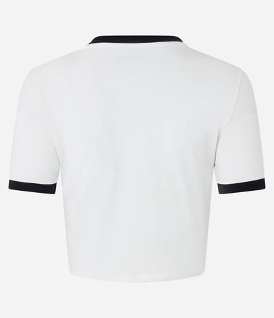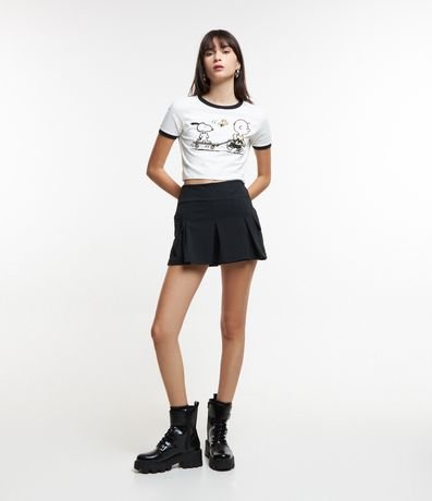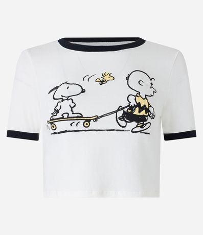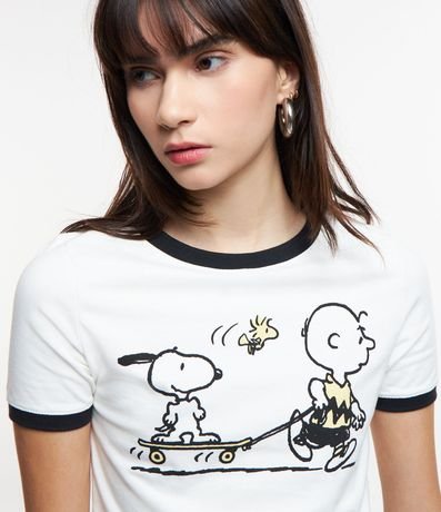 Camiseta feminina confeccionda em malha de algodão mais responsável, de modelo babylook, com gola redonda e mangas curtas. Possui estampa do Snoopy e acabamentos contrastantes.
