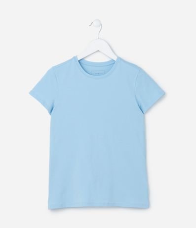 Camiseta básica infantil em meia malha com gola redonda, mangas curtas e sem estampa.