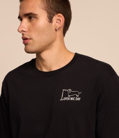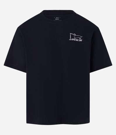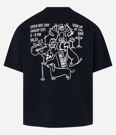 Ref: Camiseta masculina, confeccionada em algodão mais sustentável, modelo boxy, gola redonda, manga curta. Peça contém estampa com traços finos divertida de uma banda formada por cachorros.