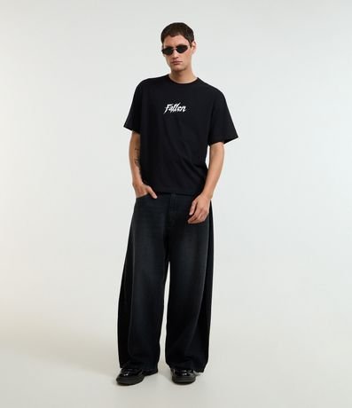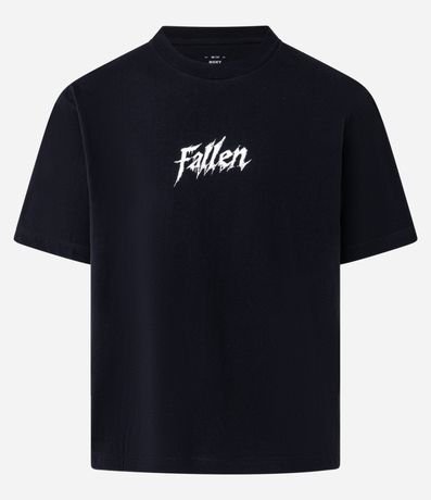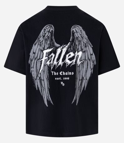 Ref: Camiseta masculina confeccionada em algodão mais sustentável através de boas práticas ambientais, no modelo boxy. Possui gola redonda, manga curta, estampa de asas e estampa lettering "Fallen" frontais e traseiras.