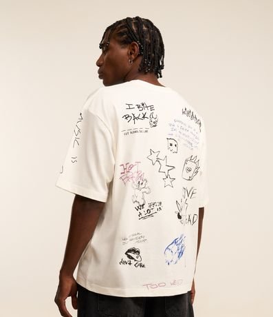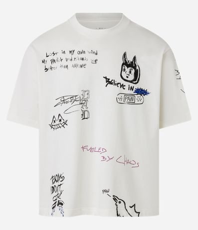 Camiseta masculina confeccionada em algodão mais sustentável com boas práticas ambientais, no modelo boxy. Possui gola redonda, manga curta, estampa de desenho, efeito escrito a mão.