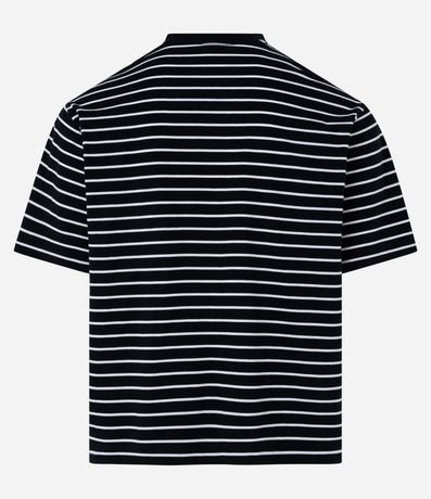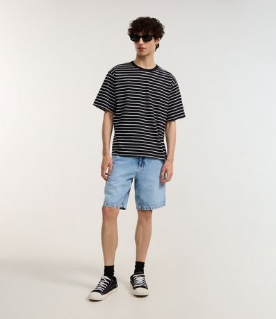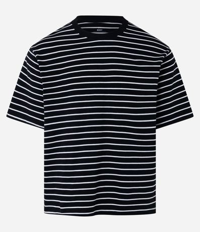 Ref: Camiseta masculina confeccionada em algodão mais sustentável, gola redonda, manga curta. Peça no modelo boxy com estampa de listras finas com cor contrastante.